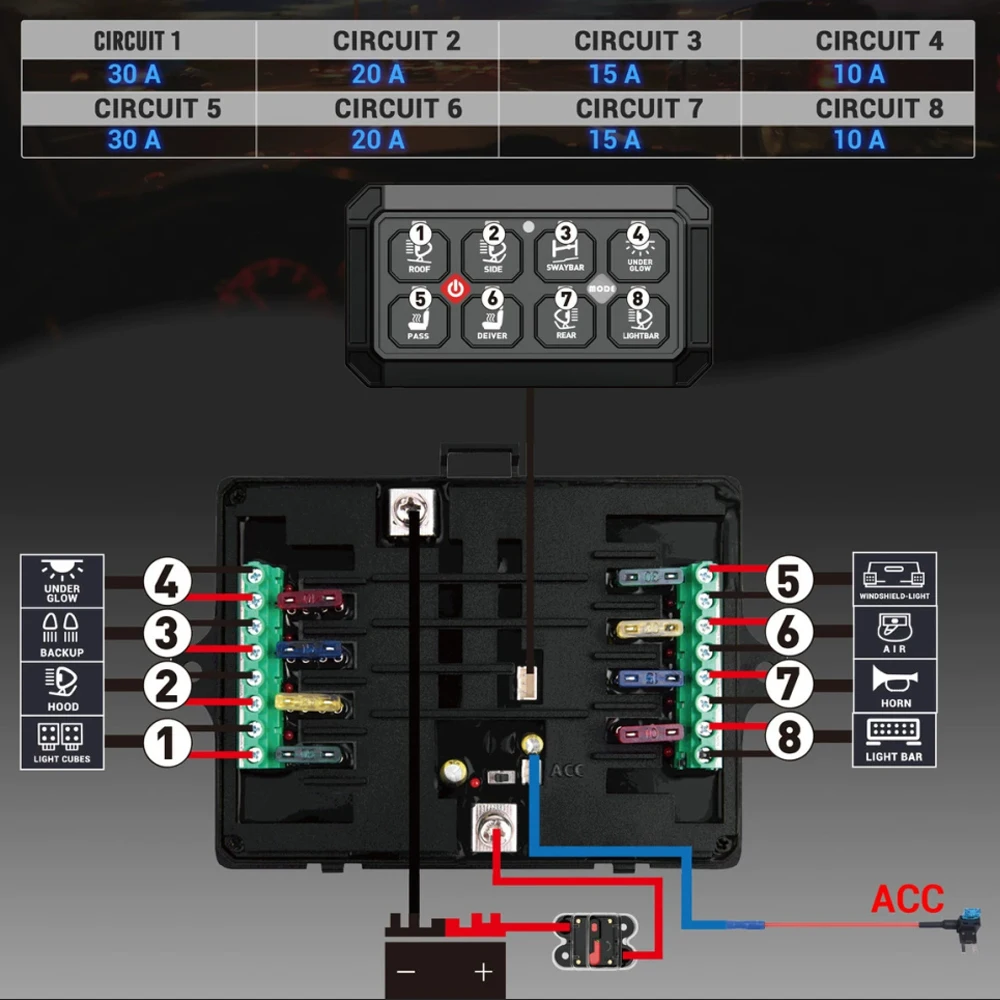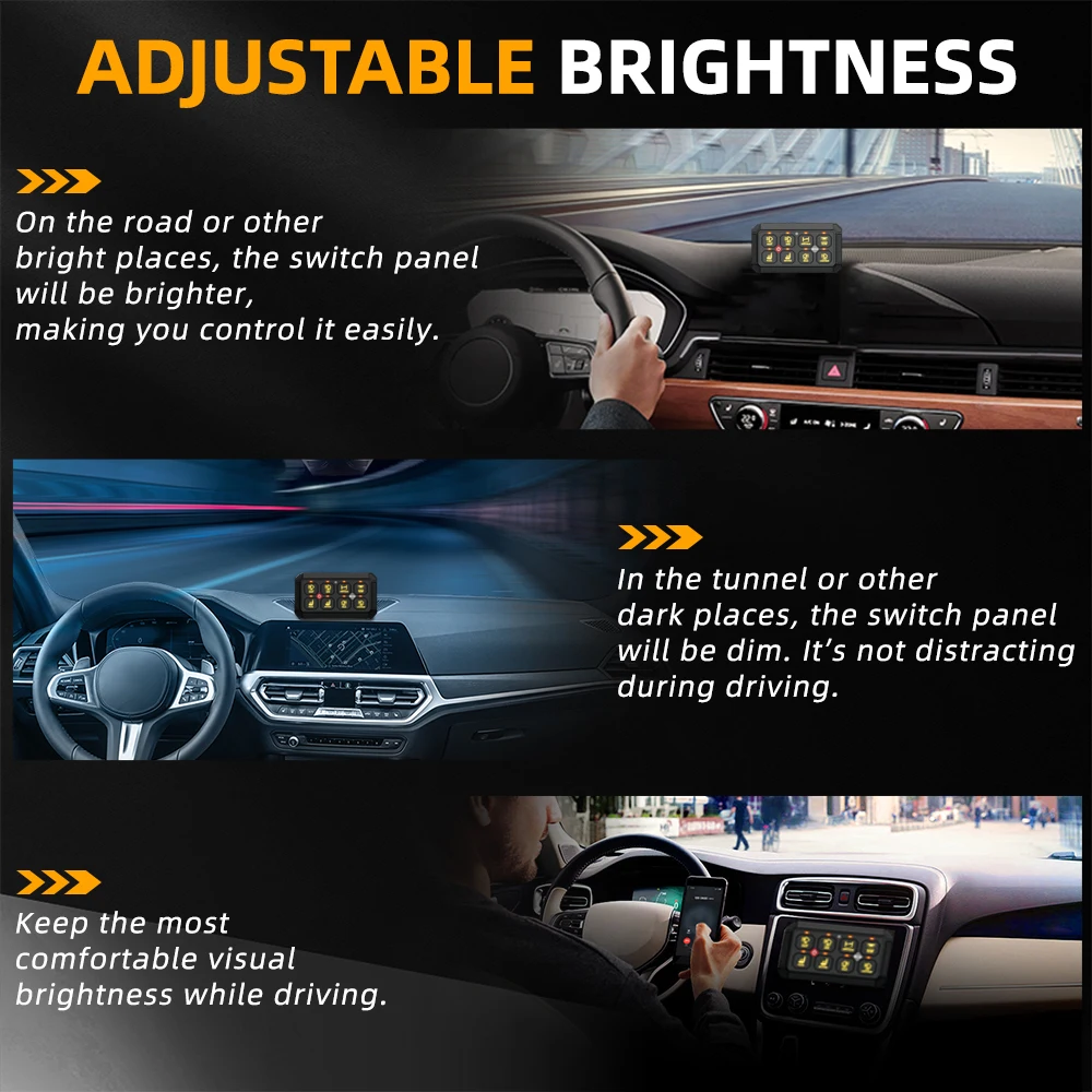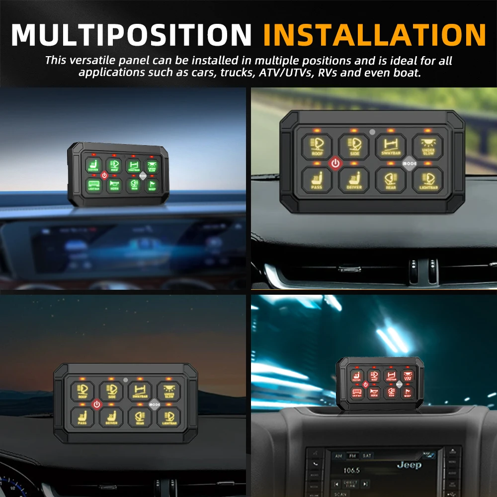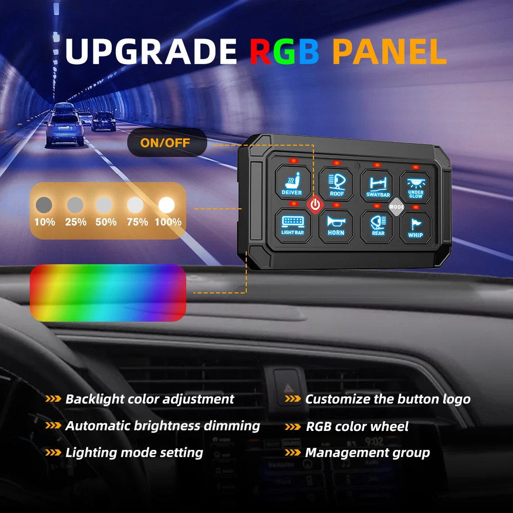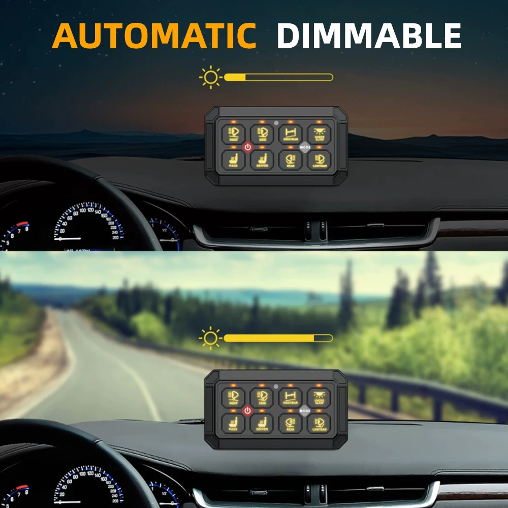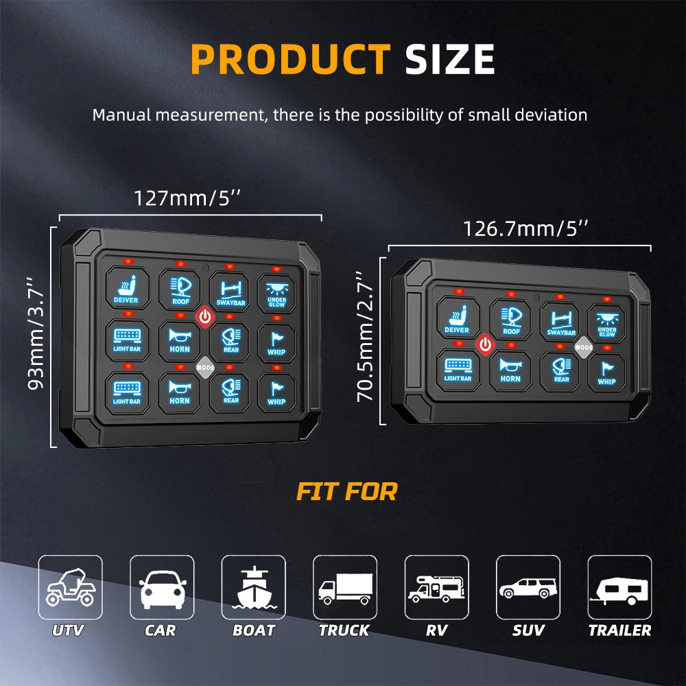 This 12-gang switch panel system allows you to control up to12 different auxiliary LED lights or electrical devicesfor 4WDs, SUVs, Caravans, and Trucks. Backed with a rugged brushed aluminum body and dimmable RGB Backlight Display, the universal 12-gang switch panel is the perfect accessory to centralize your accessories, simplifying the installation process.